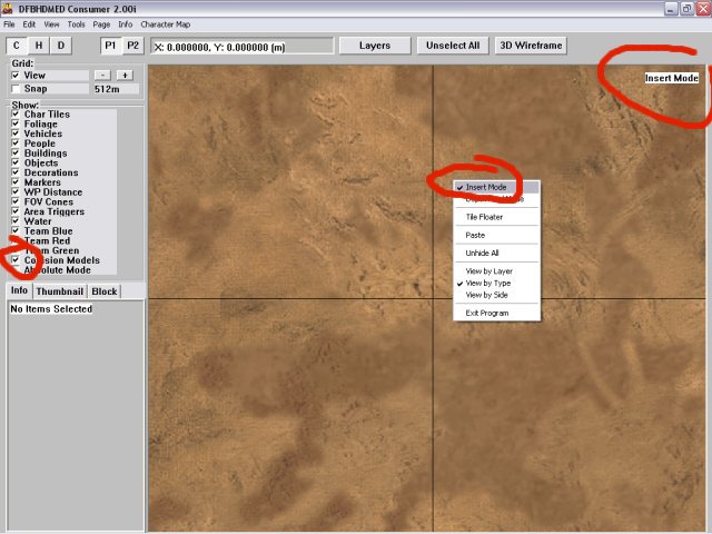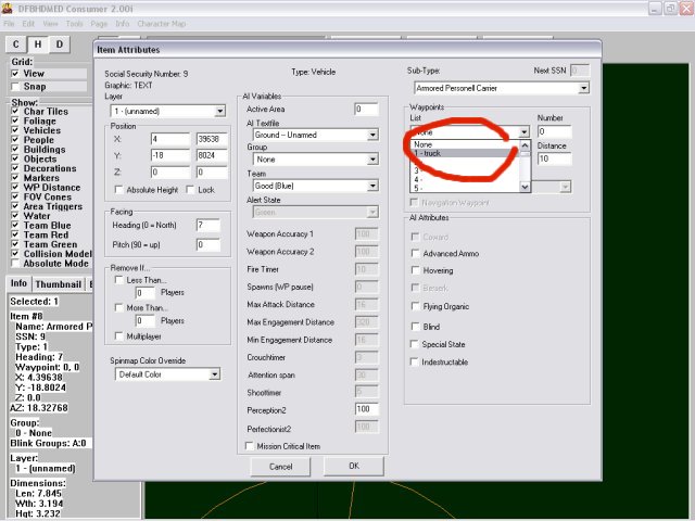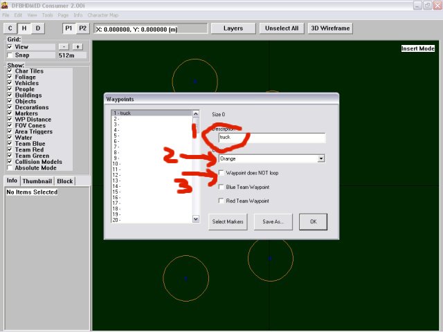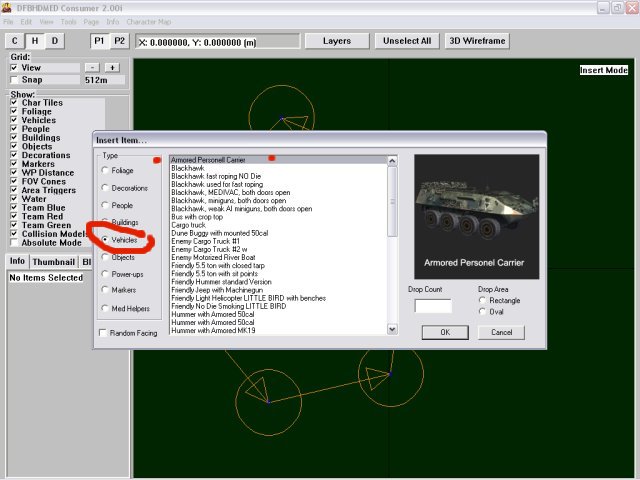 Unselect all items. Use the “Unselect All”. Right click on the terrain and select insert mode. Point to somewhere just below your first waypoint and left click, the insert item window will appear, select Vehicles, then choose a vehicle, I choose the first one in the list. See screenshot below.