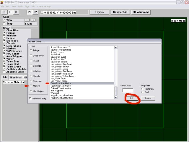 OK, your in the insert mode, lets place our start  marker, click the left mouse button right in the middle of the map and the pop up window will appear to place an item.